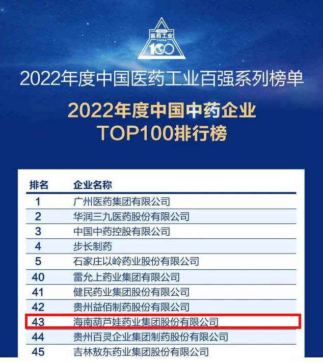 会议期间,一年一度的中国医药工业百强系列榜单隆重揭晓,菲彩国际药业集团凭借领先的研发优势和扎实的生产实力以及稳健的市场推广能力,连续第四年成功入选“2022年度中国中药企业TOP100排行榜” ,排名稳步上升至第43位。
